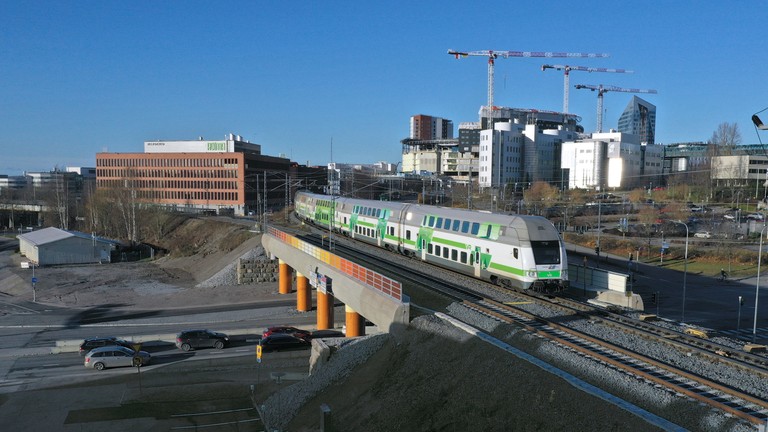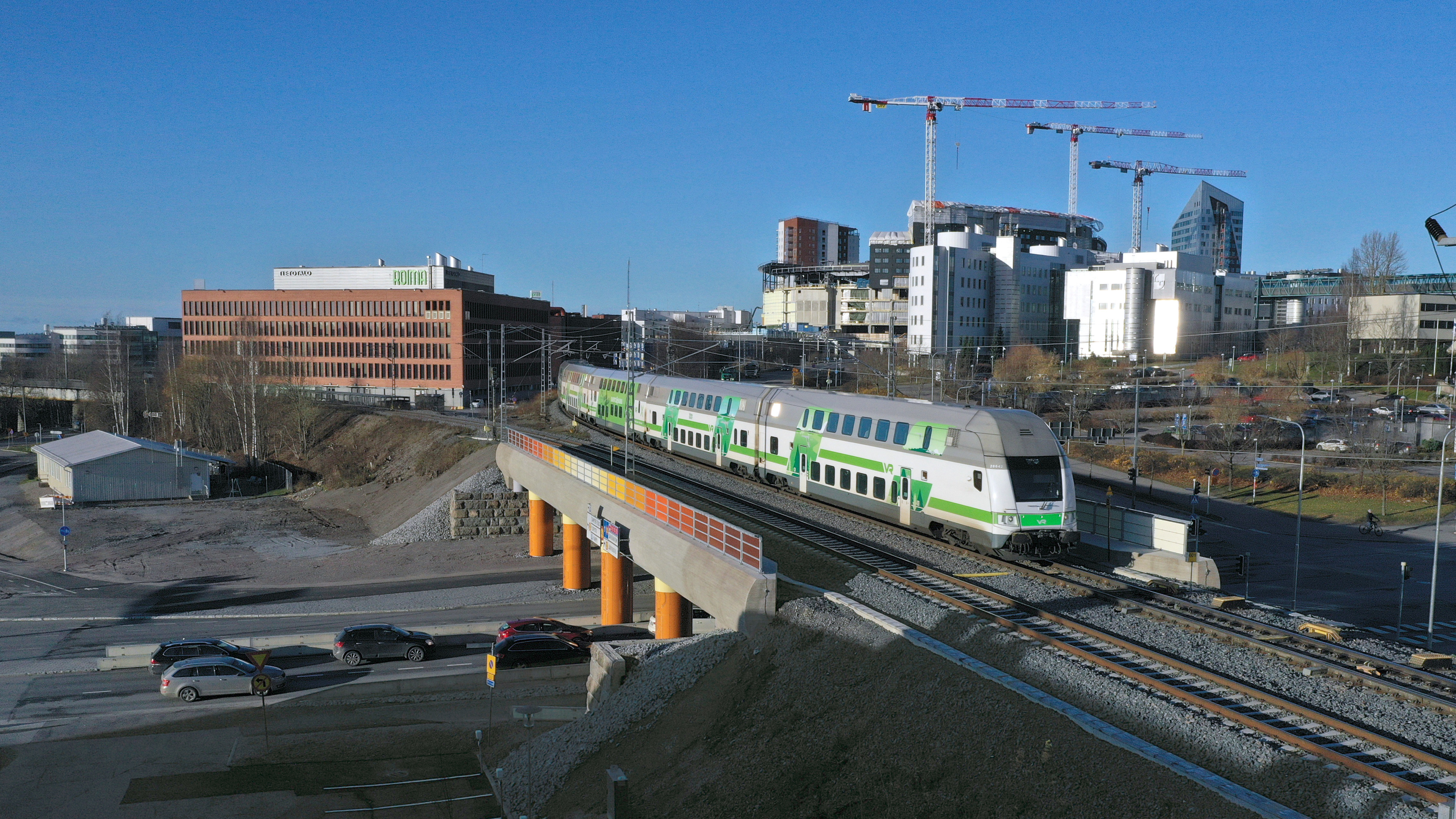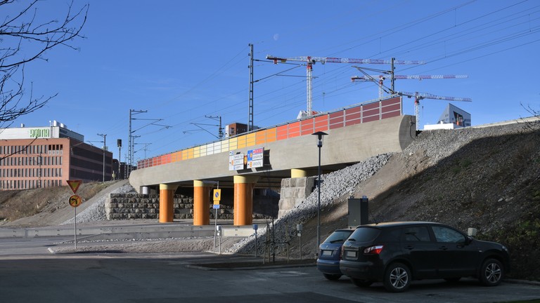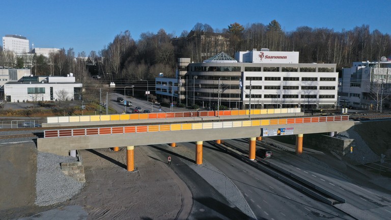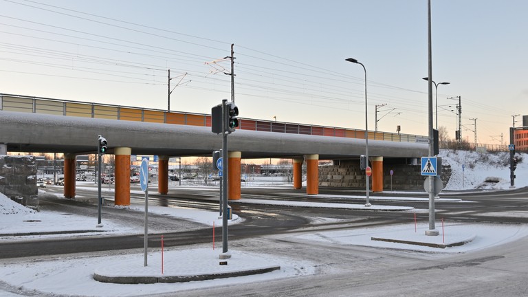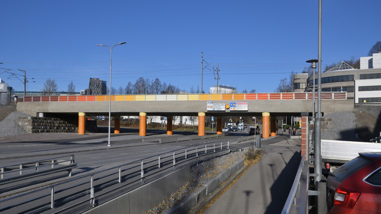 The bridge was built in 2020 with temporary traffic arrangements. The final configuration was implemented in 2024, adding lanes and increasing the clearance for the underpassing traffic from 4.0 m to 4.6 m.