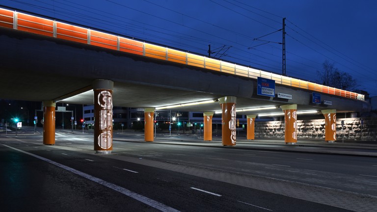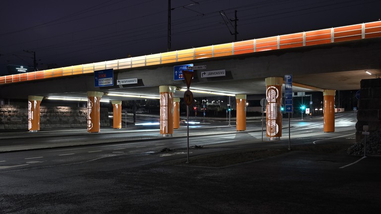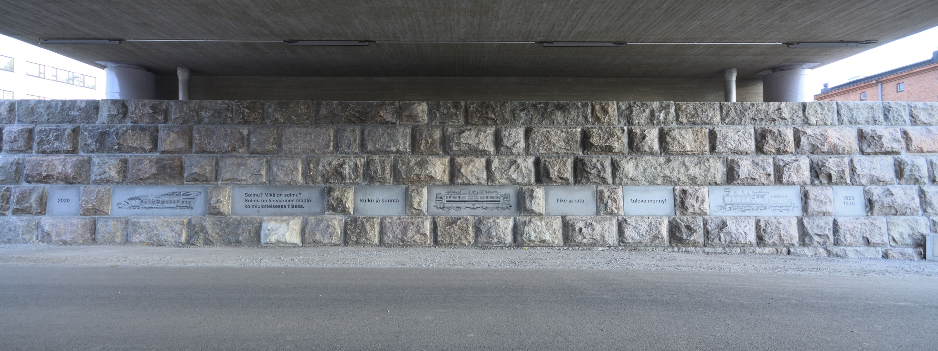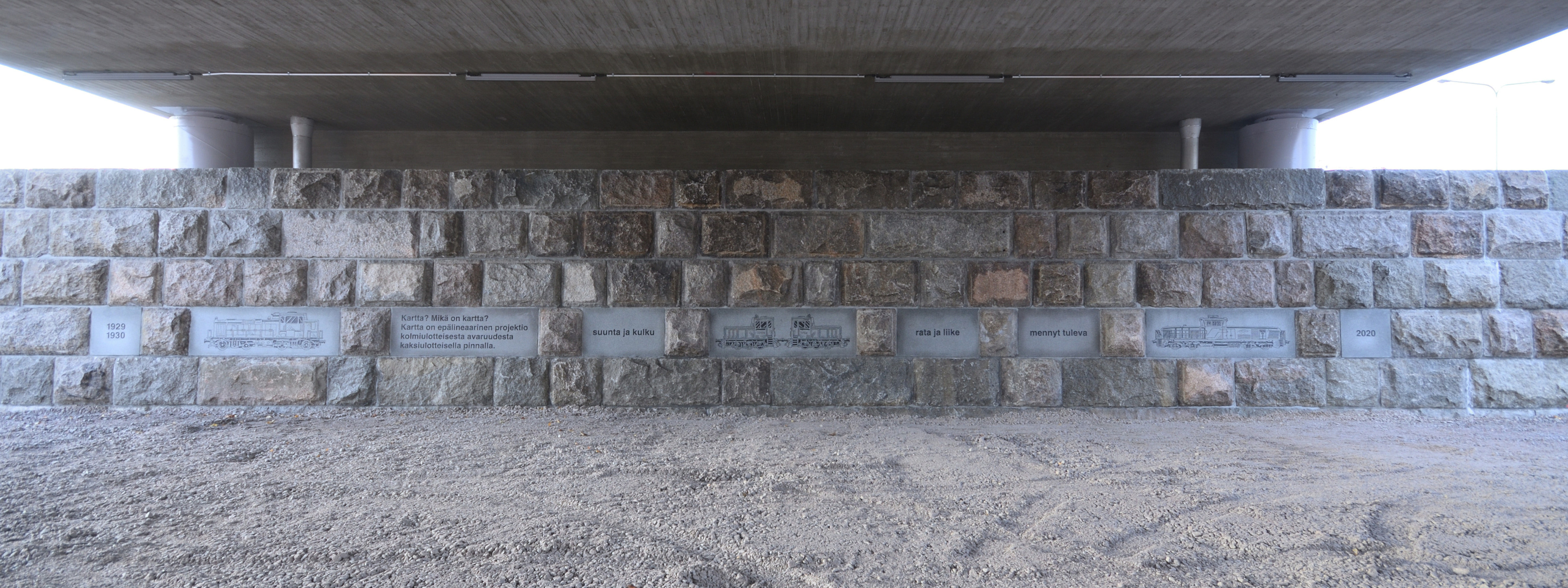 Pinni railroad bridge, Tampere. Painted steel panels on the railings. Perforated and painted steel cladding on the columns. Engraved stone slabs in the retention walls. Texts on the slabs by Mika Hannula. Lights. Railing, 2 pcs., both ca. 1 m x 60 m. Columns, 8 pcs., ca. 4 m x 1 m x 2 m. Stone slabs, 18 pcs., 60 cm x 60 cm / 100 cm / 180 cm.