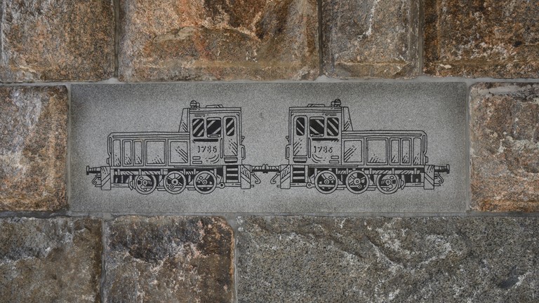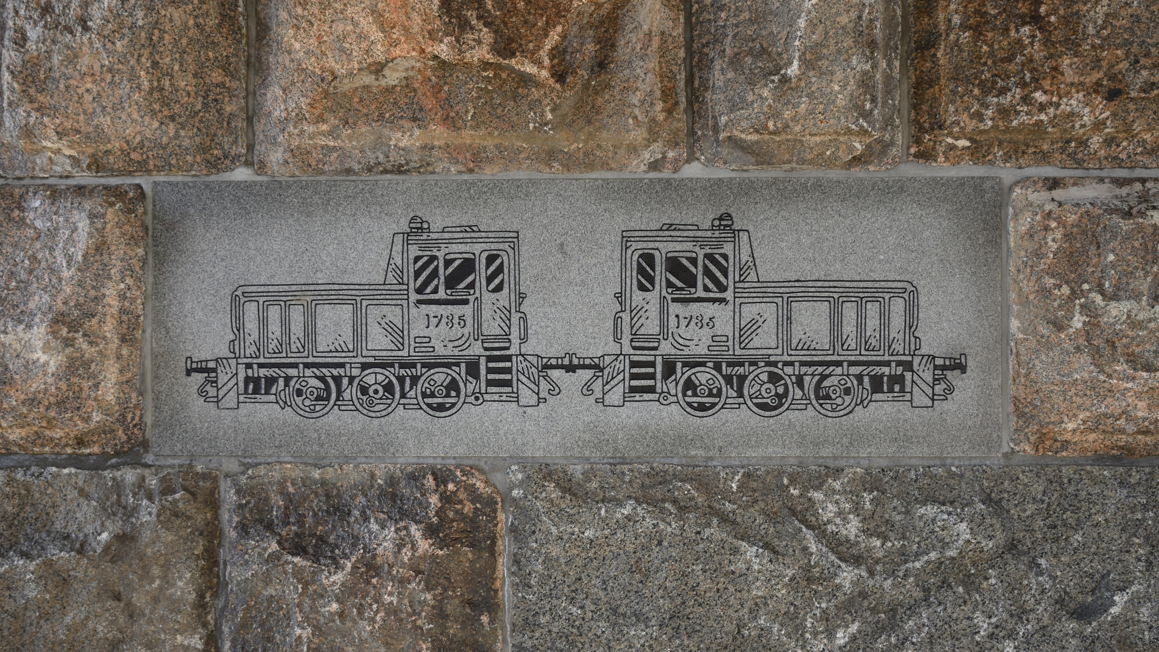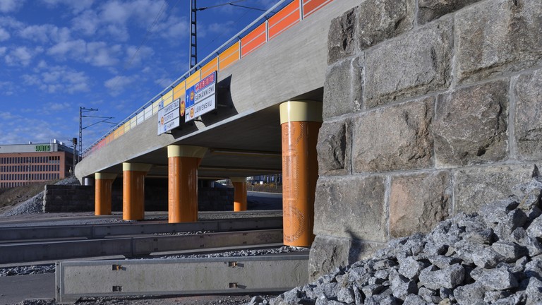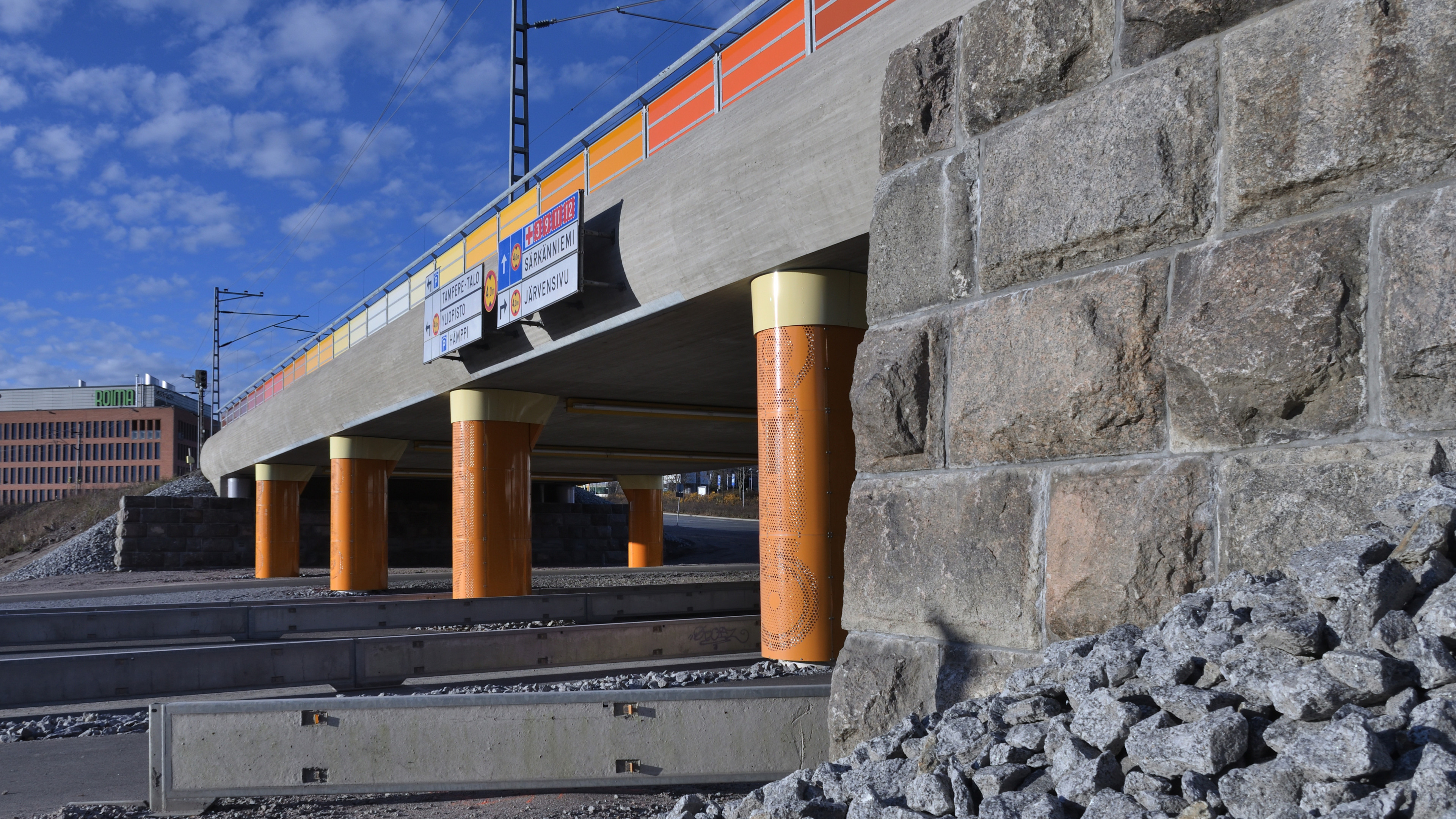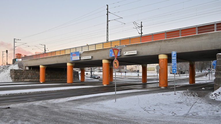 Pinni railroad bridge, Tampere. Painted steel panels on the railings. Perforated and painted steel cladding on the columns. Engraved stone slabs in the retention walls. Texts on the slabs by Mika Hannula. Lights. Railing, 2 pcs., both ca. 1 m x 60 m. Columns, 8 pcs., ca. 4 m x 1 m x 2 m. Stone slabs, 18 pcs., 60 cm x 60 cm / 100 cm / 180 cm.