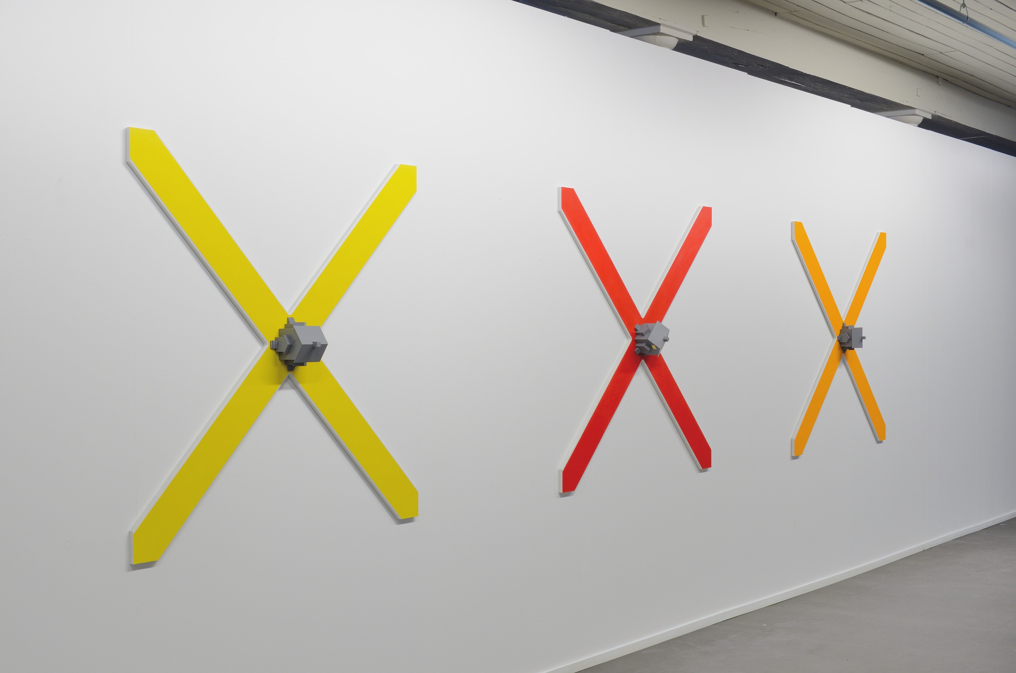Oikea hetki Oikea hetki / The Right Moment, 2019 Spraymaali vanerille ja MDF:lle / Spraypaint on plywood and MDF. Triptyykki, triptych. Jokainen osa / each part 120 cm x 120 cm x 15 cm.